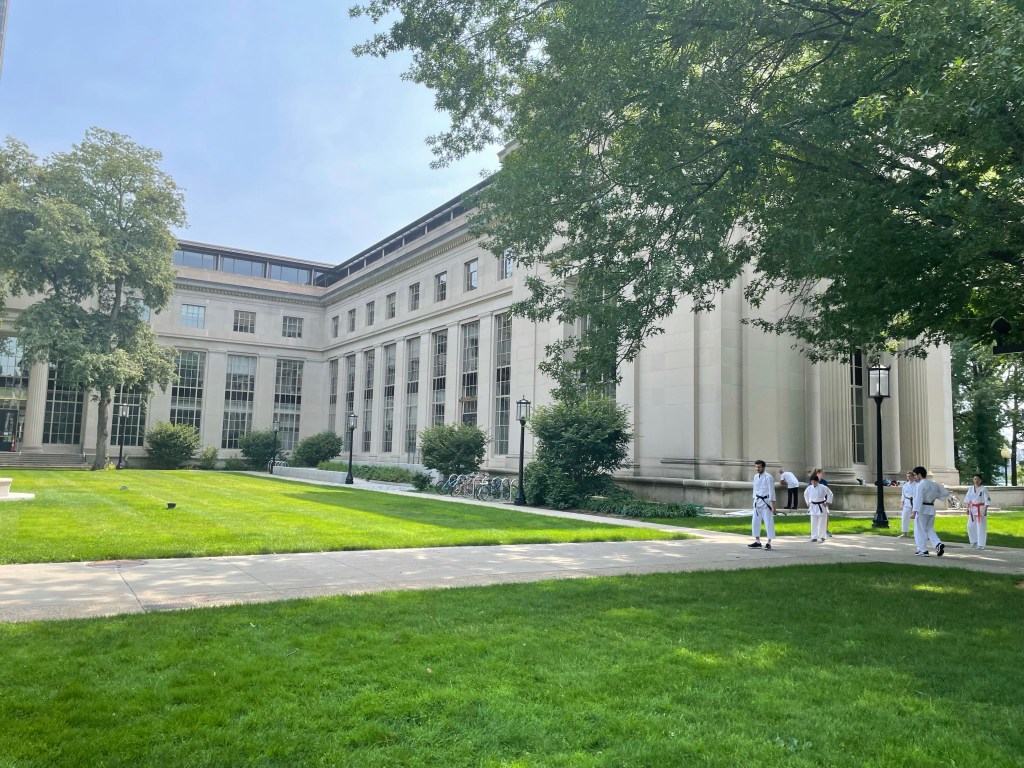 MIT campus was everything that I had expected – serene, grand and apparently alot more activity than Harvard on a summer Saturday morning. People were biking, jogging, walking along the riverfront, martial arts class in the lawns, etc. Kid #2 got a kick out of seeing the Physics Department.
